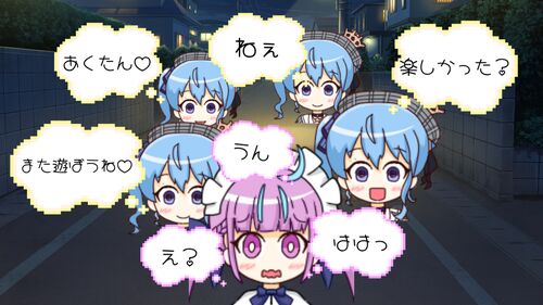 「うん。え?ははっ。」 今日の一枚 湊あくあ 星街すいせい (Vtuberグループ「ホロライブ」) 撮影場所 帰り道 星街すいせい 「ねぇ、あくたん♡」 湊あくあ 「え?」 星街すいせい 「今日、楽しかった?」 湊あくあ 「うん。」 星街すいせい 「また、遊ぼう…
