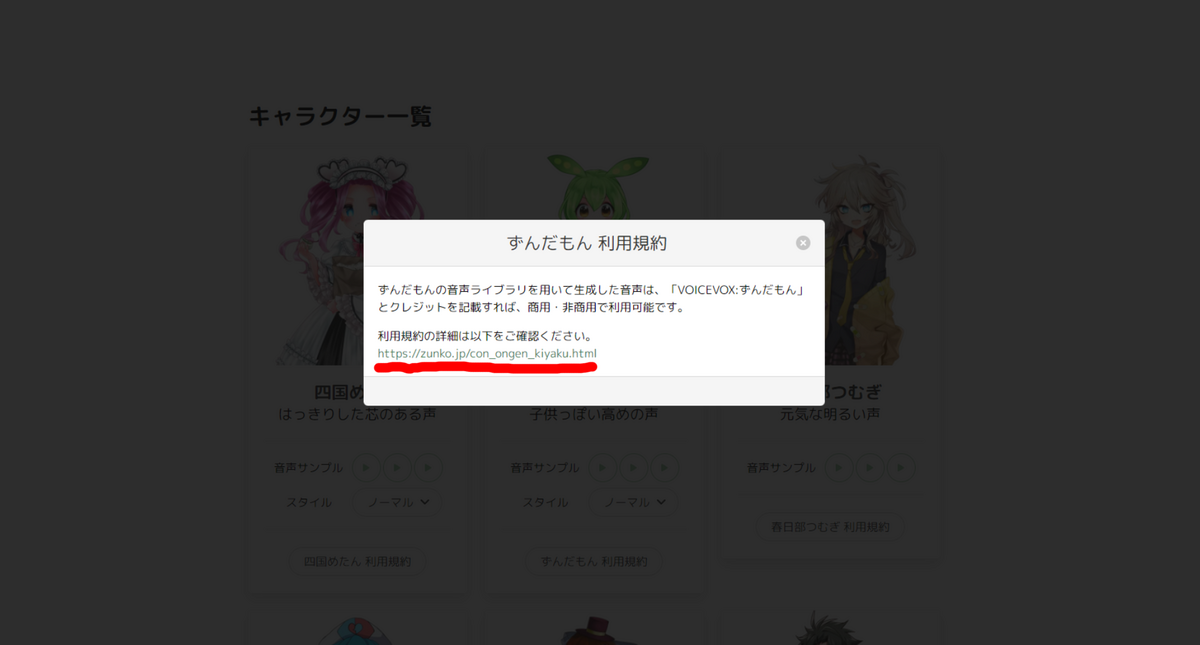 (キャラクターの利用規約は、VOICEVOX公式HPにおけるそれぞれのキャラクターの下に「〇〇 利用規約」というボタンがあるので、そのボタンから詳細を確認できます。リンクがある場合は、リンク先の内容も確認します。)